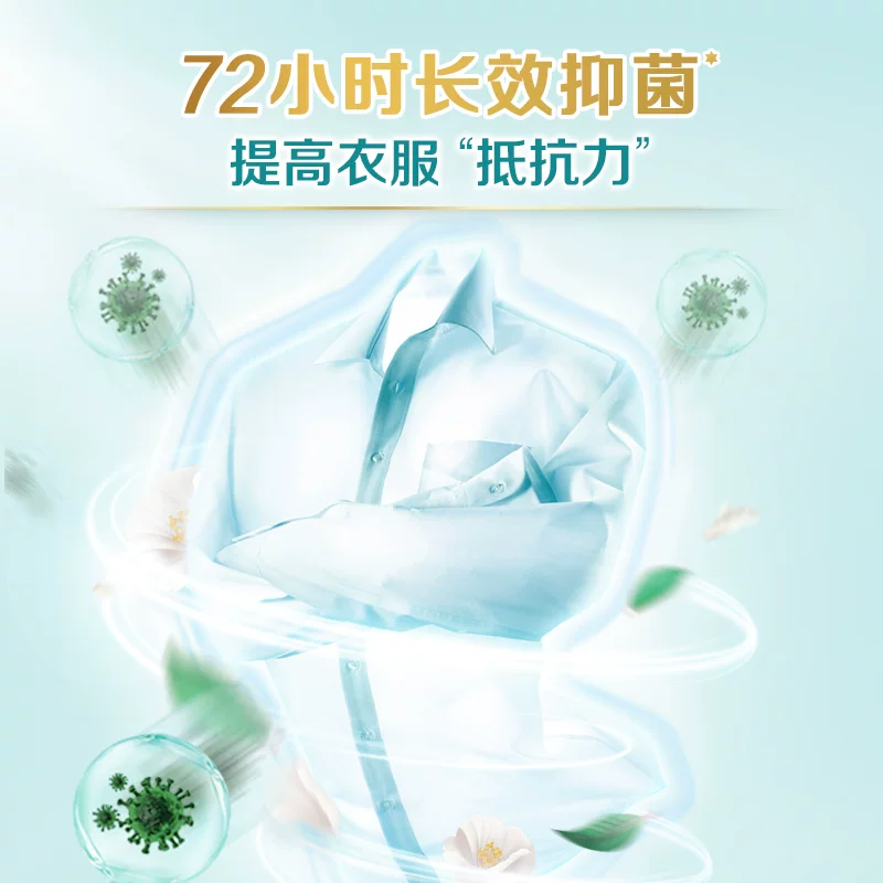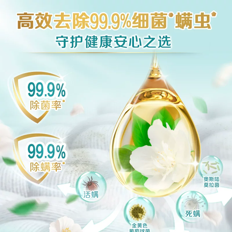 除菌率99.9%,48h长效抑菌,天然茶籽温和去渍,无荧光增白剂,低泡易漂洗。