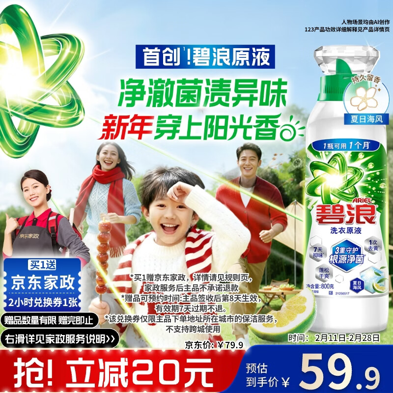 碧浪 洗衣原液800g持久留香(赠家政2小时) 47.9元
